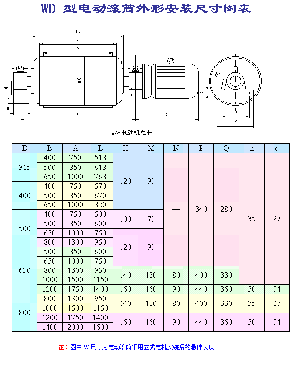 (1).因目前外裝式電動(dòng)滾筒尚未制定相關(guān)行業(yè)標(biāo)準(zhǔn),本廠將該型號電動(dòng)滾筒首位代號用W(“外裝”的首位漢語拼音)表示。外裝式電動(dòng)滾筒外置電機(jī)可分為立式電機(jī)和臥式電機(jī),用戶訂購時(shí)請加以說明;
